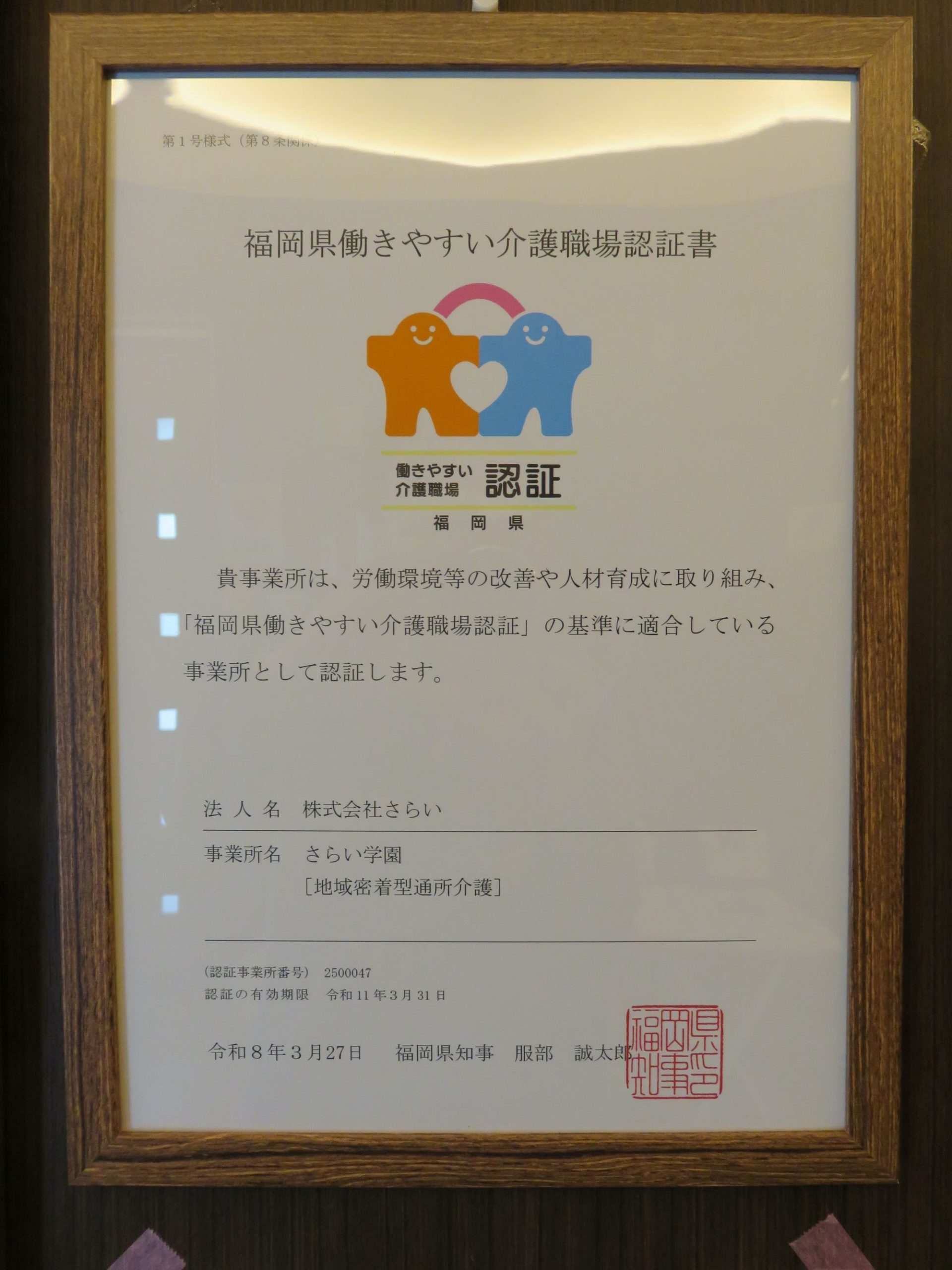 このたび、さらい学園は『福岡県働きやすい介護職場』の認証を受ける事ができました。